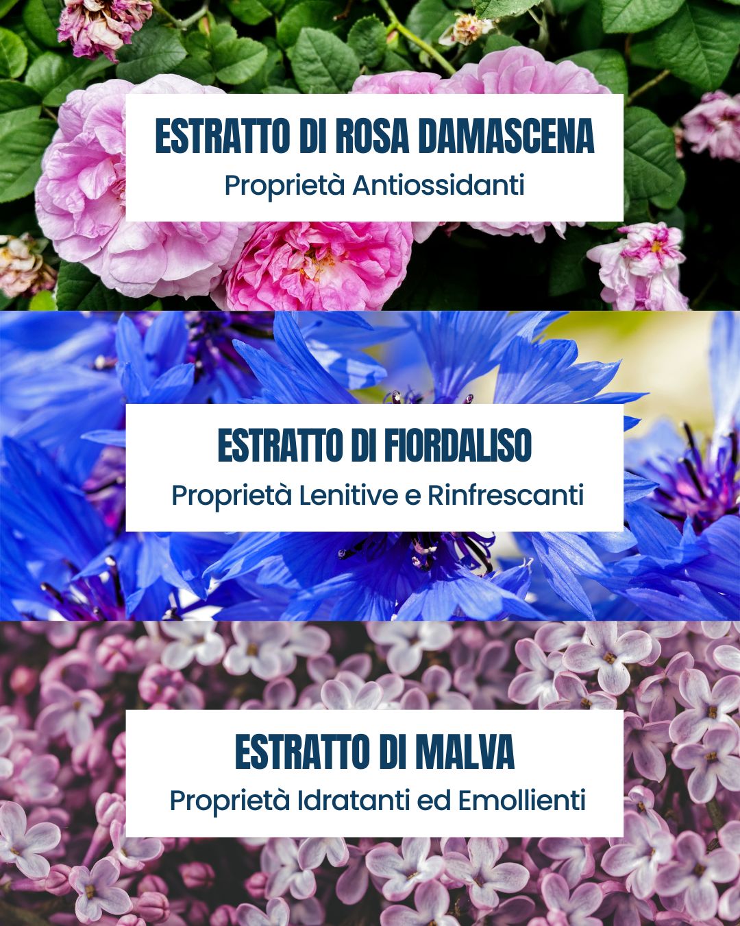 - Estratto di Rosa Damascena: lenitivo e rinfrescante, dona un’immediata sensazione di comfort e benessere.
