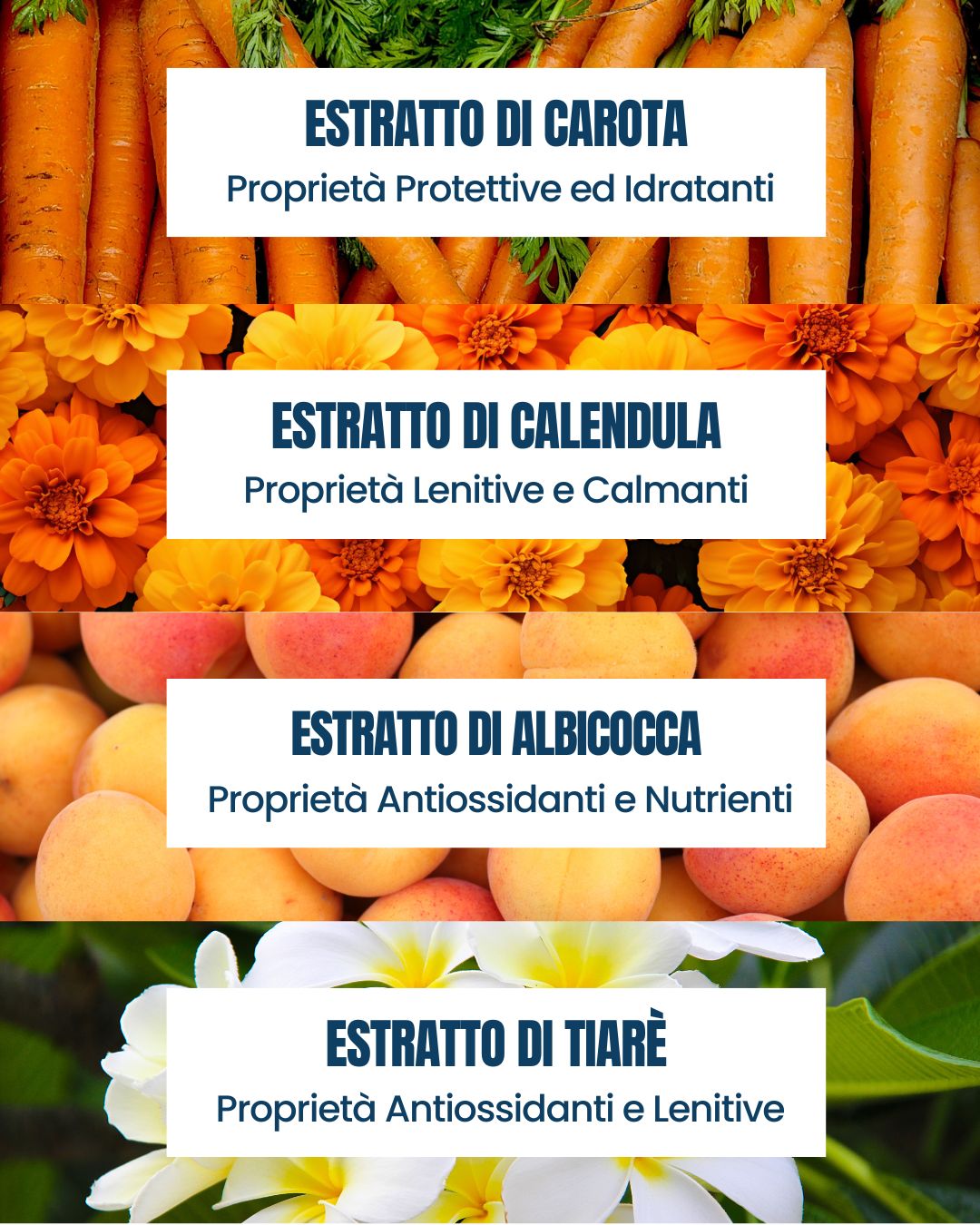 ESTRATTO DI CAROTA - Ha proprietà protettive, idratanti ed elasticizzanti. Favorisce un'abbronzatura uniforme e dorata.