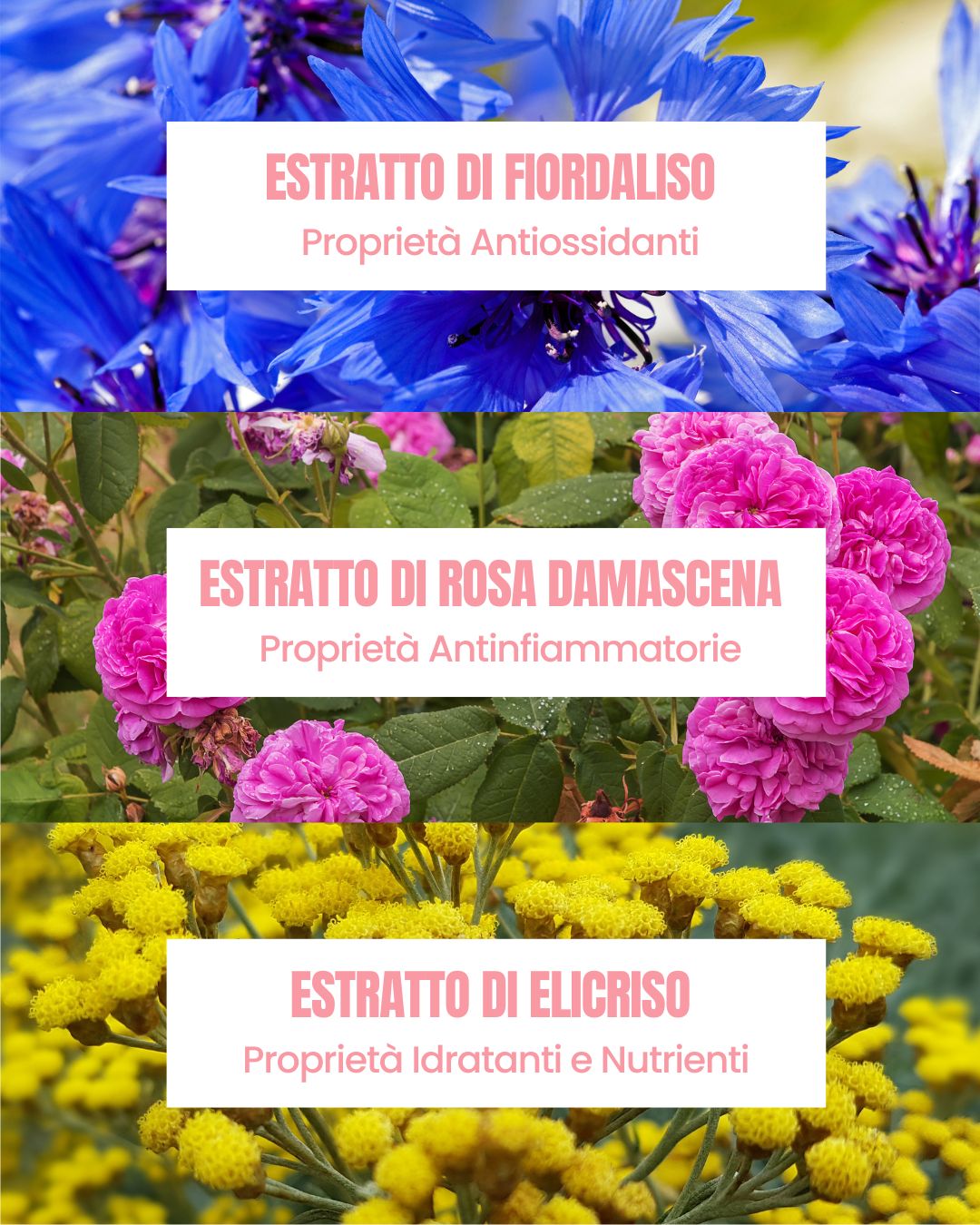 - Acqua di Rosa Damascena, Gelsomino e Fiordaliso: lenitive e rinfrescanti, donano una sensazione di freschezza e comfort alla pelle.
