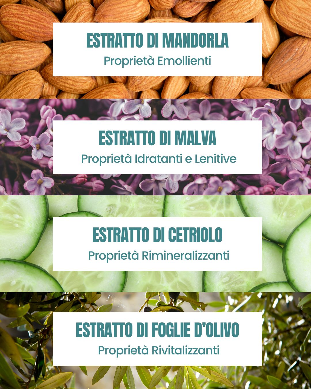- Estratto di mandorla biologica – emolliente e nutriente, dona morbidezza.