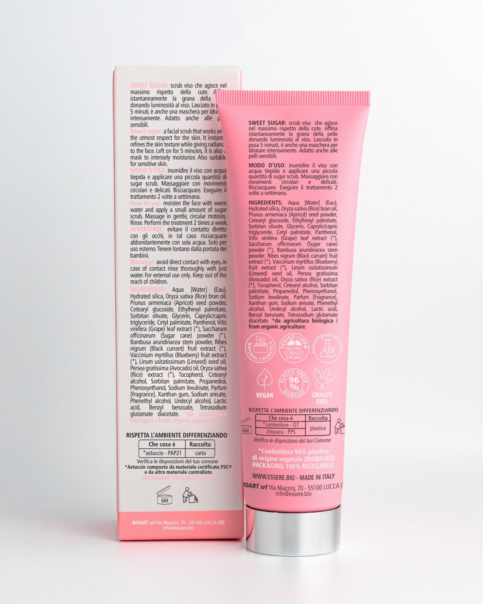 Sweet Sugar – Scrub Viso 2 in 1 è uno scrub viso con il 96,9% di ingredienti di origine naturale. Arricchito con polvere di bambù micronizzata, zucchero di canna, polvere di nocciolo di albicocca, estratti di frutti rossi e pantenolo, offre un'azione esfoliante delicata e un'idratazione intensa. Ideale per tutti i tipi di pelle, anche le più sensibili.