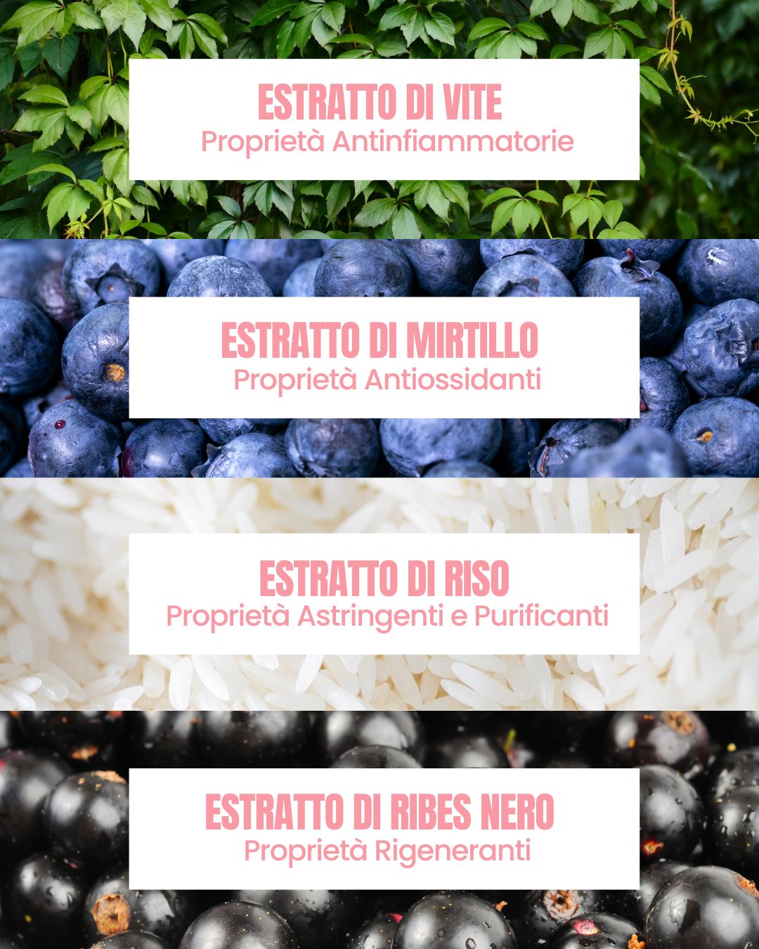 - Estratti di Frutti Rossi: come ribes nero, mirtillo e uva, con proprietà lenitive, antiossidanti e antiarrossamento, che donano freschezza e tonicità alla pelle.