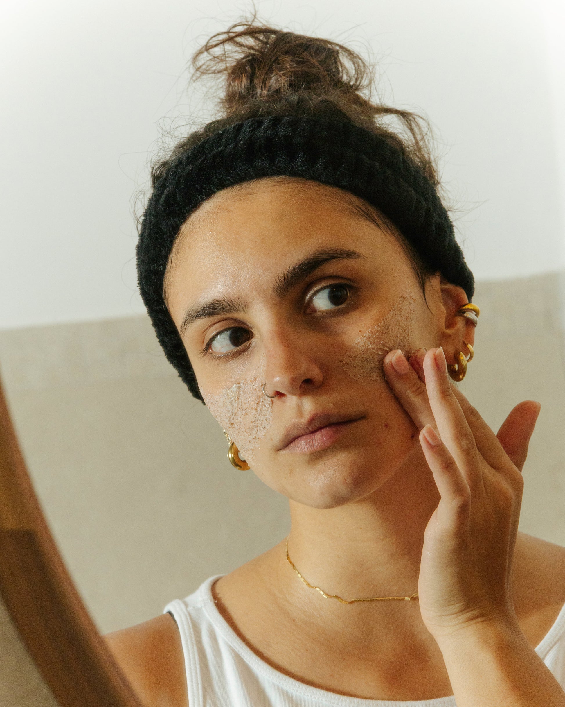 Inumidire il viso con acqua tiepida e applicare una piccola quantità di sugar scrub.
