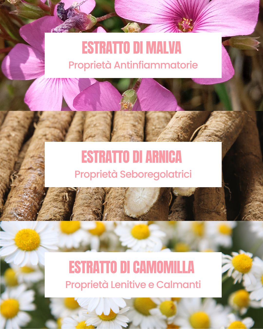 - Estratti Botanici Biologici: come Arctium Lappa (bardana), Chamomilla Recutita (camomilla) e Malva Sylvestris (malva), con proprietà purificanti, lenitive e antiossidanti.